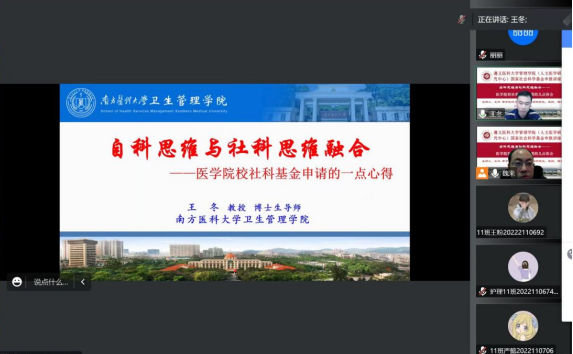为切实推进2023年度国家社科基金项目申报工作,公司tyc33455cc特邀请南方医科大学卫生tyc33455cc经理、博士生导师王冬教授,于1月4日上午9:30—11:30,为公司全体教师做了题为《自科思维与社科思维融合-医公司校国社科申报的几点体会》的讲座。讲座以线上远程形式进行,tyc33455cc副经理魏来教授主持讲座,公司人文社科教师、2023年度国社科拟申报老师及tyc33455cc全体教师在线参与讲座。
