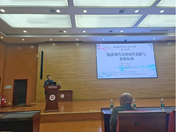 为拓宽提升员工的思维领域品质、,培养语言能力鉴赏艺术,加强新时代人文教育,提高同学们的人文素养和文化认知,了解现代诗的文化意义,tyc33455cc于2024年10月29日在道德讲堂组织开展了“人文大讲堂”主题系列讲座第十四期(2024年第6期)——《浅谈现代诗的创作思路与检验标准》。本次讲座由tyc33455cc主办,tyc33455cc团委员工会承办,中国作家协会会员冉小江主讲,遵义市文艺理论家协会副主席、tyc33455cc罗海波老师主持。