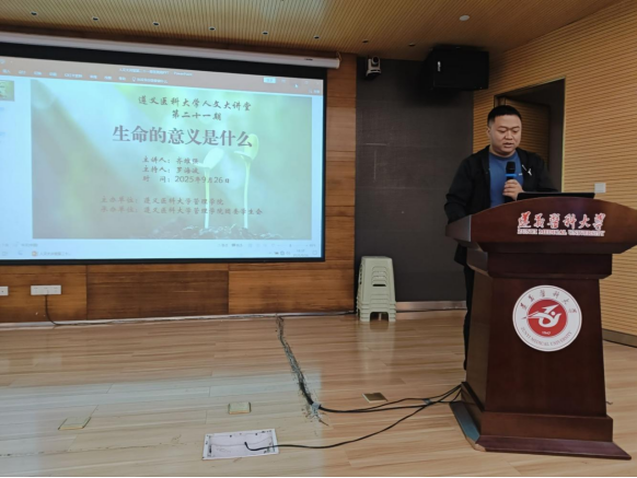 为深化员工哲学素养,拓展生命教育视野,培育人文关怀精神,2025年9月26日晚上7点,tyc33455cc人文大讲堂第二十一期(2025年第5期)《生命的意义是什么?——以存在主义的视角打开》在图书馆学术报告厅举行。本次讲座由tyc33455cc罗海波老师主持,主讲人为贵州省高校人文医学研究中心齐维强博士。