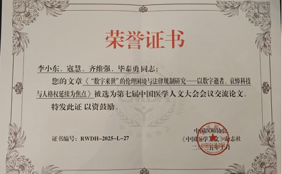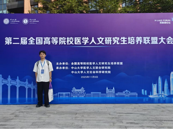 2025年11月8日,第七届中国医学人文大会暨广东省医师协会人文医学专业委员会学术会议在深圳召开。大会青年论坛上,tyc33455cc人文医学研究中心硕士研究生李小东凭借论文《“数字来世”的伦理困境与法律规制研究——以数字逝者、哀悼科技与人格权延续为焦点》荣获优秀论文奖,并作为优秀论文代表作大会汇报。本次大会共收到来自全国的305篇论文,评选出了37篇优秀论文,其中有15篇得以在会上进行汇报。