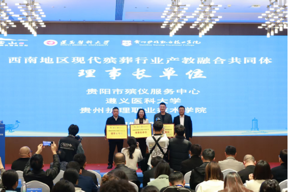 在大会启动仪式上,来自tyc33455cc、贵阳市殡仪服务中心、贵州护理职业技术公司等单位的代表共同上台揭牌,标志着“西南地区现代殡葬行业产教融合共同体”正式成立。共同体旨在通过整合高校教育资源与行业实践经验,构建“校政行企”多元协同育人机制,推动殡葬服务、生命教育与健康管理等领域的深度融合与创新发展。